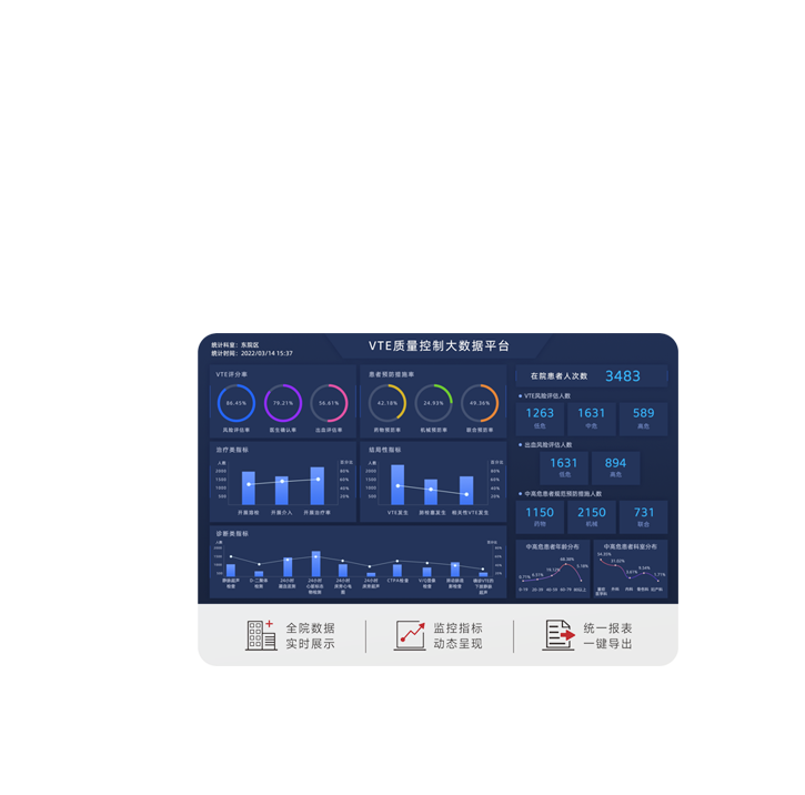 通过VTE预防评估系统软件,将来自院内医嘱系统、病历系统等其他系统的有关VTE疾病的数据进行智慧化分析处理,完成住院患者VTE评估、中高危患者筛查、监控管理,帮助临床医生、医务管理人员搭建院内VTE预防信息化体系。